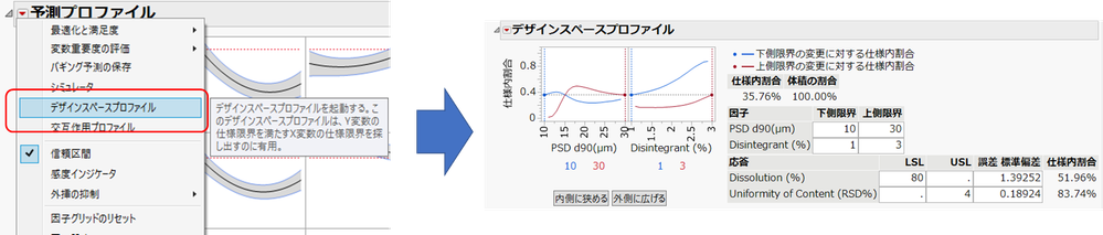 現時点での最新バージョン「JMP 17」では「予測プロファイル」のオプションとして「デザインスペースプロファイル」という機能が追加されました。