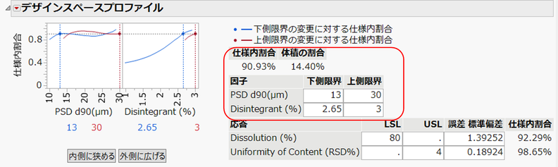 体積の割合:最初の因子の領域(この例では「PSD d90」が10~30, 「Disintegrant」が1~3 )を100%としたとき、現在の因子限界設定による領域の相対的割合(「PSD d90」を13~30, 「Disintegrant」を2.65~3 に狭めると、最初の因子領域に対し約14.4%の領域に狭まる)