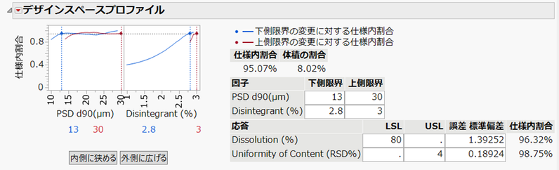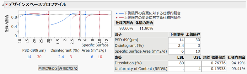 仕様内割合:現在の因子に対する限界設定で、応答が仕様限界内に収まる確率
