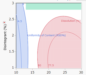 もう少し確率を上げたいのでDisintegrantの下側を2.8に設定し、範囲を狭めてみましょう。左側のグラフは各因子に対し仕様限界を設定した際、仕様内割合がどのように変化するかを示していますので、こちらを見ながら設定していくのも良いでしょう。