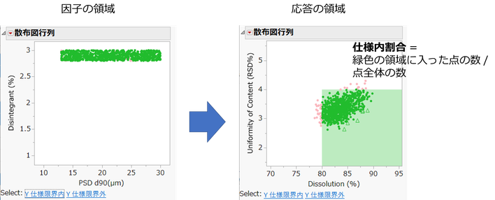 JMPでは予測プロファイルに「シミュレータ」というオプションがありますが、こちらは決められた因子の範囲内で乱数を発生し、Yが仕様限界内に収まらない割合(不適合率)を求めています。一方、デザインスペースプロファイルはこの逆で、適合している割合を求めています。