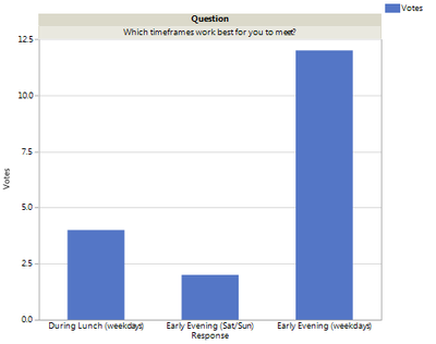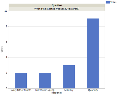 - The Survey. Wendy brought a printed survey to help us make some decisions around meetings, officers, and food. Here are the results: