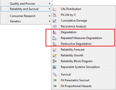 Ok, let’s get into the degradation analysis platforms in JMP. You can find all three platforms under the Analyze>>Reliability and Survival menu.