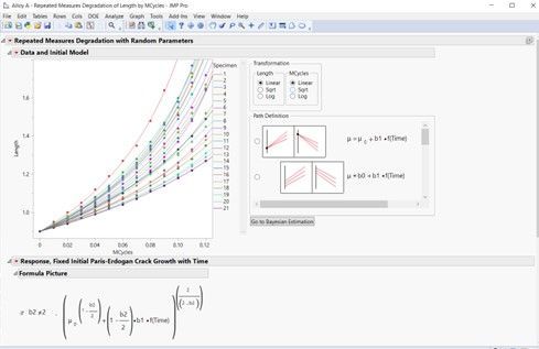 What are its limitations? The repeated measures part of the platform follows the so-called pseudo-failure approach to analyze repeated measures degradation data. It requires two consecutive but separate analyses to get the lifetime distribution, whereas the standalone Repeated Measures Platform can produce the life distribution directly from a fitted degradation model. In addition, specifying your own model requires knowledge of JSL.