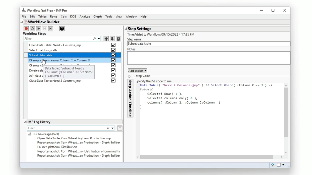 The Workflow Builder is a JMP utility to capture, build, manage, and share data preparation and analysis workflows. The Workflow Builder uses the Enhanced Log to capture actions as you work in JMP. Use the Workflow Builder to do any of these actions: automate a workflow, share a workflow, re-run a sequence of steps with new data and archive or document an analysis.