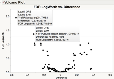 From the chart below we can see that only two points (log2in_TMS1 = 1.948 FDR LogWorth and log2in_BcDNA_GH06717 = 1.367 FDR LogWorth) are above the reference line of FDR LogWorth 1.3 (more than 95% confidence in the statistical difference in the mean comparison). Also, we can tell from the direction Difference that in both cases the “SAM” Line mean is smaller than the “ORE” Line mean as indicated by the negative values. Lastly the magnitude of the Difference would tell us that the farthest significant point (log2in_TMS1 = -0.533) has a greater difference than the next significant point (log2in_BcDNA_GH06717 = -0.319).