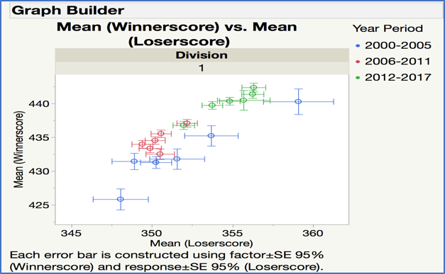 Now we are ready to visually analyze this data! Plotting this “means by year” data can be risky, as sample sizes can vary from year to year, and division to division. Also, the popularity of tournaments in increasing over time, meaning higher amounts of available data each year. Therefore, we calculated the standard error of the mean so we could then build 95% confidence intervals around the means to make for easier mean to mean comparisons of significance. To show this on the graph we can take advantage of a new feature in JMP 14 Graph Builder that allows for Two-Way Interval Error Bar views.