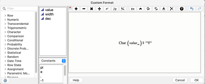 Graph axes have long supported custom label formats, which are JSL expressions that can produce arbitrary axis labels. Here's an example that adds "°F" to the y-axis labels.