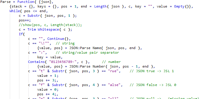 the variable pos walks through the length of the string, to end, one character at a time. The real magic in Xan's code is in the handling of the [, ], {, } characters. I just copied the magical parts into the replacement code. Above, you can see the handling for quotation mark, colon, t, f. Those characters direct the parser's handling of subsequent characters.